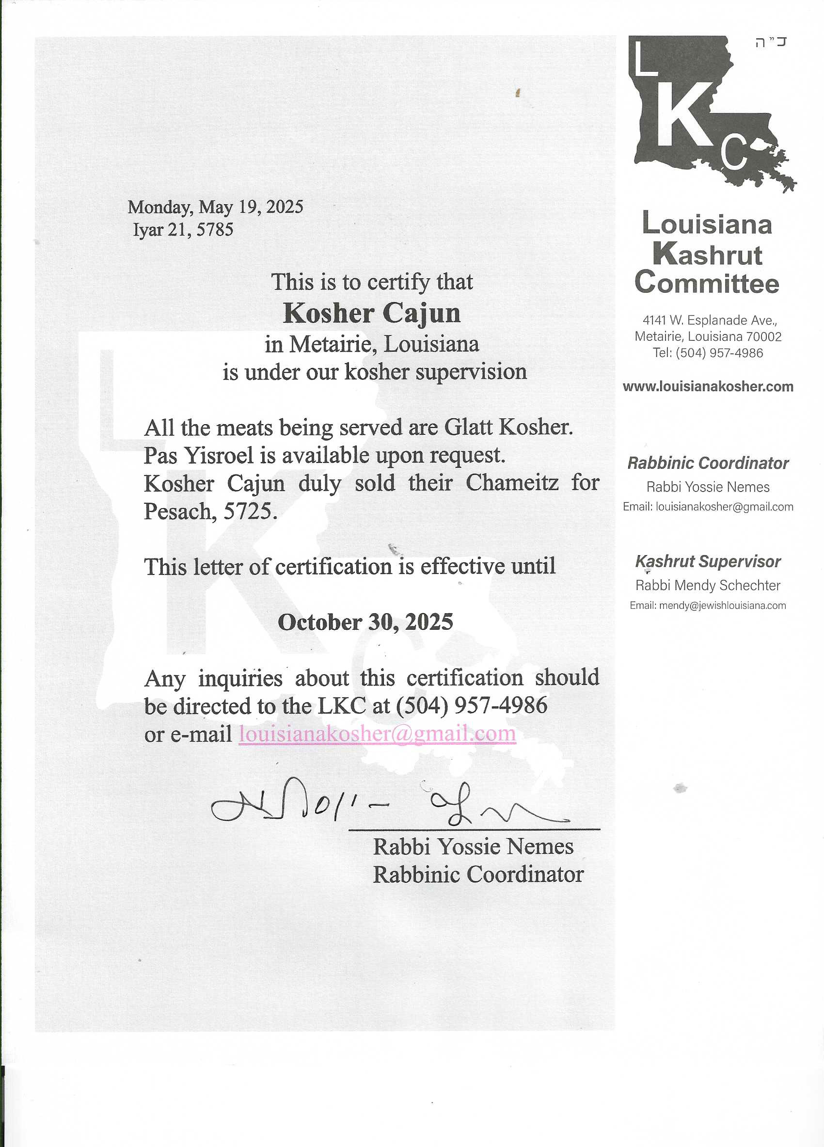 Kosher Cajun New York Deli & Grocery is conveniently located in Metairie & offers a large variety of authentic New York specialties – all Kosher certified. Kosher Cajun offers the finest deli foods, including corned beef, pastrami, tongue, salami, chopped liver, whitefish, knishes, rugelach and Dr. Brown’s sodas.